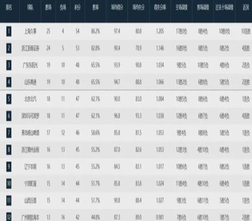 目前上海队以25胜4负高居联盟榜首,广东队19胜10负位列第三,北京队18胜11负第五,吉林队12胜17负排名第15位。