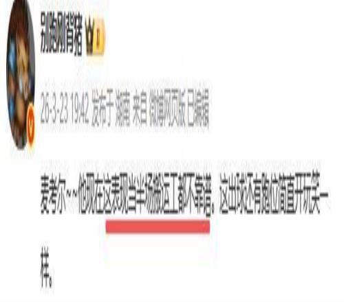 别跑刚背猪究竟批的是谁呢?没错,他批的是打首发的小外援麦考尔。昨晚在三个小外援中,表现最差的是麦考尔,他根本打不了控卫,很难串联球队,很难组织起有效的战术,多余动作太多太难看,突破又突不起,毫无杀伤力,全场只有两次罚球,可以说杀伤力为0。没突破,没三分,没组织,货真价实的三无小外援,要这样的外援有何用?也难怪媒体人怒批麦考尔这表现当半场搬运工都不靠谱。其实这位关心广东队的媒体人,早在第一阶段就建议裁掉正在养伤的麦考尔。现在看来杜锋让他留下,就是一个大错误。